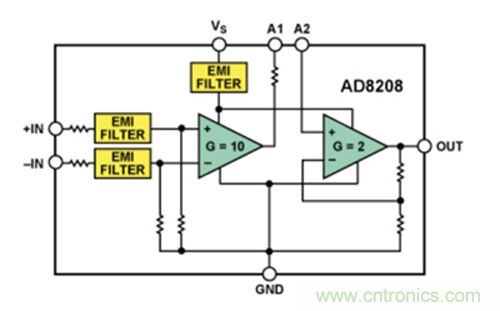 AD8208的更多詳情:AD8203(圖A)是一款單電源差動放大器,非常適合在大共模電壓情況下放大和低通濾波小差分電壓。采用+5 V單電源供電時,輸入共模電壓範圍為-2 V至+45 V。該款放大器提供增強的輸入過壓和ESD保護,並內置EMI濾波功能。