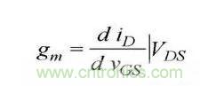 在轉移特性曲線上,gm 是曲線在某點上的斜率,也可由iD的表達式求導得出,單位為 S 或 mS。