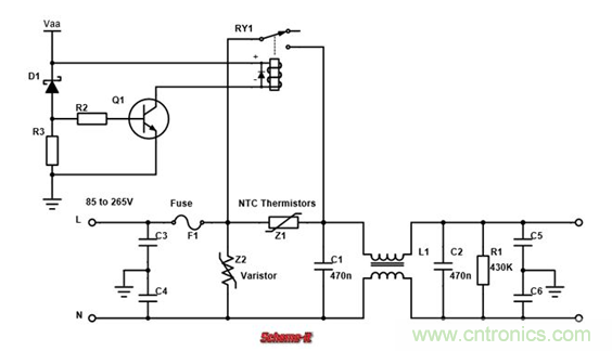 繼電器初始是斷開的。當Vaa逐漸達到自身電壓的時候,齊納二極管D1導通,三極管Q1打開,繼電器RY1閉合,相當於把限流NTC熱敏電阻Z1短路。