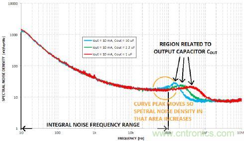 但是,如何表示LDO輸出的噪聲有多大呢?可用如上文所示的積分噪聲頻率範圍表示。這個範圍通常是10赫茲至100千赫。