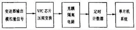 另一種模擬量傳輸的解決方法,就是采用VFC(電壓頻率轉換)方式,如圖3所示。現場變送器輸出模擬量信號(假設電壓信號),dianyapinlvzhuanhuanqijiangbiansongqisonglaidedianyaxinhaozhuanhuanchengmaichongxulie,tongguoguangougelihousongchu。zaizhujice,tongguoyigepinlvdianyazhuanhuandianlujiangmaichongxuliehaiyuanchengmonixinhao。cishi,xiangdangyuguangougelideshishuziliang,keyixiaochuguangoufeixianxingdeyingxiang。zheshiyizhongyouxiao、簡單易行的模擬量傳輸方式。