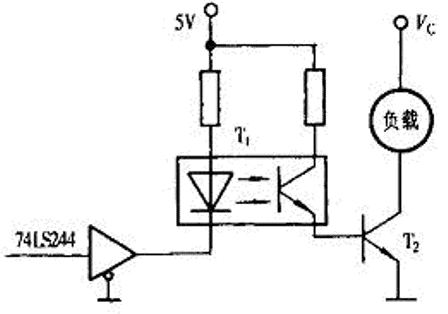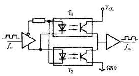 用2隻光電耦合器T1,T2接成互補推挽式電路,可以提高光耦的開關速度,如圖5所示。當脈衝上升為“1”電平時,T1截止,T2導通。相反,當脈衝為“0”電平時,T1導通,T2截止。這種互補推挽式電路的頻率特性大大優於單個光電耦合器的頻率特性。