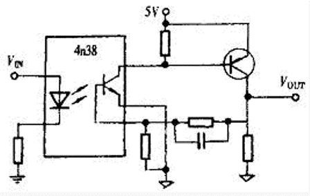 此外,在光敏三極管的光敏基極上增加正反饋電路,這樣可以大大提高光電耦合器的開關速度。如圖6所示電路,通過增加一個晶體管,四個電阻和一個電容,實驗證明,這個電路可以將光耦的最大數據傳輸速率提高10倍左右。
