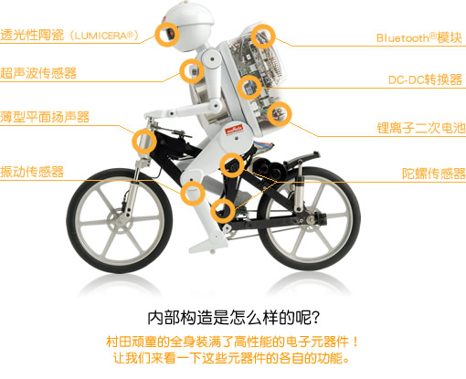 村田製作所在本屆高交會上展示了會騎單車的小機器人——村田頑童,每次演示都吸引了大量觀眾。村田頑童是村田製作所2005年發布的,至今已經3周歲,但是他那精湛的騎單車技術仍然吸引了眾多觀眾的駐足。