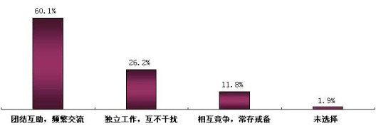 weilegengshenrulejiedianzigongchengshideshengcunhuanjing,womenteyishezhilezhegewenti。duimeiyiweigongchengshilaishuo,tongshiguanxichulideruhe,zhijieyingxiangzhetamendegongzuozhiliangheshenghuozhiliang,lianghaodetongshiguanxi,lirenliji,ligonglisi。tebierangwomenxinweideshi,60.1%的電子工程師和同事處於團結互助,頻繁交流的工作狀態,在目前經濟危機的陰霾籠罩下,這樣同事關係顯的尤為重要。(見圖表七)