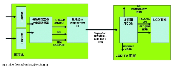 如圖2所示,DisplayPort還可以實現電視麵板的直驅,使得定標器或視頻處理器集成到計時控製器(timing controller-TCON)中或者直接放入機頂盒中。DisplayPort 還是一個具有專用雙向命令通道(AUX)的智能顯示器接口。AUX的優勢遠不止這些,因為它可實現電視設計範例的變換,可以取代現有的速度較慢的命令接口,如I2C,並實現係統軟件和顯示信號間更好的一致性,這將有助於這些設備的大數據量的圖像處理。AUX tongdaohaibianyudianshixitongshejijieduandetiaoshi。gaijidingheshangdechuliqikeyibiancheng,yiyunxingyushetiaoshihuoceshiruanjian,shixianyunxingshijianjianzhahuocuowuzhuangtaihuifu。