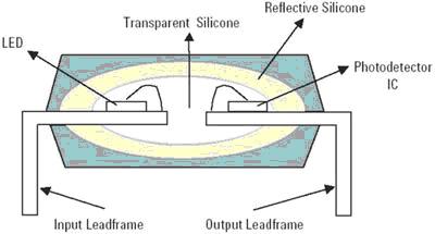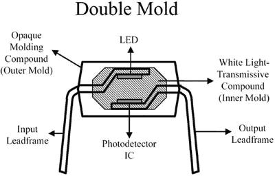 然後,組合好的引線框使用白色光傳導化合物進行澆鑄,構成光導裝置,把光從LED傳送到IC光電檢測器上。白色化合物還提供了高壓絕緣功能。最後,得到的組件使用不透明的化合物澆鑄,構成最終的封裝輪廓。