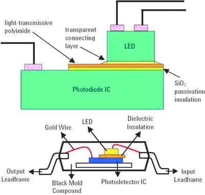 圖4是光學耦合器的橫截麵圖,其中LED直接堆疊在光電探測器IC上。這種堆疊式LED方法的主要實現技術是背麵發光LED的開發。