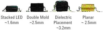 輕薄、小型封裝:總封裝高度現在單純取決於IC、LED、超薄聚酰亞胺和LED焊接線高度的厚度組合。