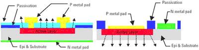對背麵發光的LED,其激活層在透明基底上生長,摻雜程度取決於所要求的發射光波長。發光區域在晶片製造工藝中確定,基底在器件上保持不變。