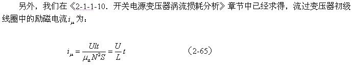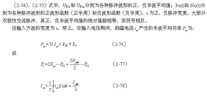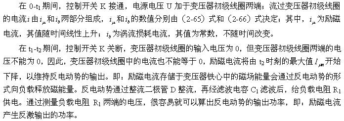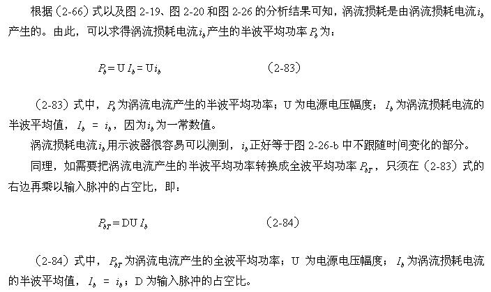 順便指出:(2-84)式的結果,是認為渦流損耗在t1-t2期間(圖2-26-b)完全等於0而求得的,但實際上,在t1-t2期間變壓器初級線圈產生的反電動勢同樣也會在變壓器鐵芯中感應產生渦流損耗電流,即當輸入電壓為0時刻,在變壓器鐵芯中還存在很短暫時間的渦流損耗;由於這種渦流損耗是由反電動勢提供能量來維持的,它將隨著反電動勢能量的衰減很快就衰減到0。