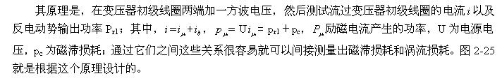 因此,(2-81)、(2-82)、(2-83)、(2-84)式(shi)最(zui)好(hao)隻(zhi)用(yong)於(yu)對(dui)正(zheng)激(ji)式(shi)輸(shu)出(chu)的(de)單(dan)激(ji)式(shi)開(kai)關(guan)電(dian)源(yuan)變(bian)壓(ya)器(qi)進(jin)行(xing)磁(ci)滯(zhi)損(sun)耗(hao)和(he)渦(wo)流(liu)損(sun)耗(hao)功(gong)率(lv)測(ce)試(shi),因(yin)為(wei)其(qi)初(chu)級(ji)線(xian)圈(quan)的(de)電(dian)感(gan)相(xiang)對(dui)比(bi)較(jiao)大(da),勵(li)磁(ci)電(dian)流(liu)比(bi)較(jiao)小(xiao);如果需要對反激式輸出的單激式開關電源變壓器進行測試,最好隻用於對小功率開關電源進行對比測試。