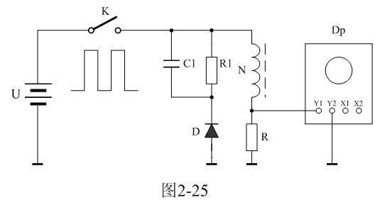 圖2-25中,U是電源電壓,通過控製開關K不斷地接通和關斷,就可以把電源電壓調製成單極性電壓脈衝;N為變壓器初級線圈,D為反激輸出整流二極管;R1為反激輸出負載電阻;C1為濾波電容;R為取樣電阻,通過測量R兩端的電壓,就可以知道流過變壓器初級線圈的電流;取樣電壓被送到示波器Dp進行顯示。