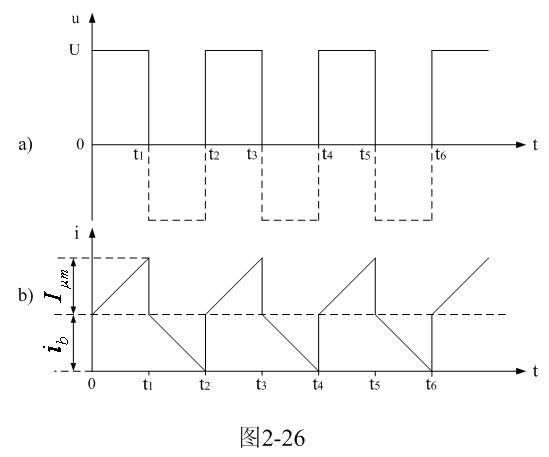 圖2-26是圖2-25電路中變壓器初級線圈兩端電壓以及電流波形圖。圖2-25中,通過改變控製開關K的占空係數,可使變壓器初級線圈正好工作於電流臨界連續狀態或電流斷續狀態,即:流過變壓器初級線圈中的電流在下一次控製開關K接通之前為0。