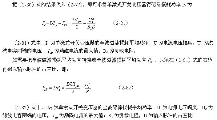 從(2-81)式和(2-82)式還很難看出,單激式開關電源變壓器的磁滯損耗主要與誰相關,因為等式右邊的減數和被減數與輸入電壓、脈衝寬度都有相同變化的趨向。實際上在脈衝寬度固定的情況下,單激式開關電源變壓器的磁滯損耗是很小的,此結果在《開關電源變壓器磁滯損耗分析》的章節中已經分析過。