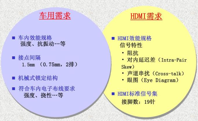 車用視頻係統越來越受歡迎,因此汽車生產商希望在他們的汽車裏集成HDMI連接功能。HDMI1.4guigeweihuiyingqicheshengchanshangdexuqiu,tichulegongnengqiangdadexinxingcheyonglianjiexitong,kezaicheneizuoyihoufanghuojiashimianbanshangdexianshishebeishangtigongzhengaoqingshipin,bingtongshifuheqichedaolujiashizhongjiaoweiyankedexingnengyaoqiu。