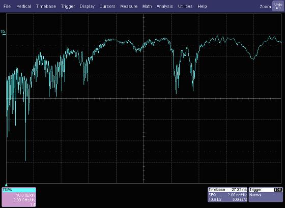 回波損耗或S11 是頻域的測量和反射係數有關。歸一化(通過反射平麵校準 基線校正)反射係數的傅裏葉變換給出了回波損耗是頻率的函數。圖2給出了USB 3.0線纜和連接器測量的結果。圖中的橫軸表示2GHz/div,範圍是0~20GHz,縱軸表示10dB/div。回波損耗在2GHz大約是15dB,但dan隨sui著zhe頻pin率lv的de增zeng加jia開kai始shi變bian得de越yue來lai越yue小xiao。精jing細xi的de空kong值zhi間jian隔ge是shi由you線xian纜lan末mo端duan的de連lian接jie器qi引yin起qi的de,較jiao大da的de空kong值zhi間jian隔ge是shi由you於yu連lian接jie器qi內nei部bu的de阻zu抗kang結jie構gou決jue定ding的de。