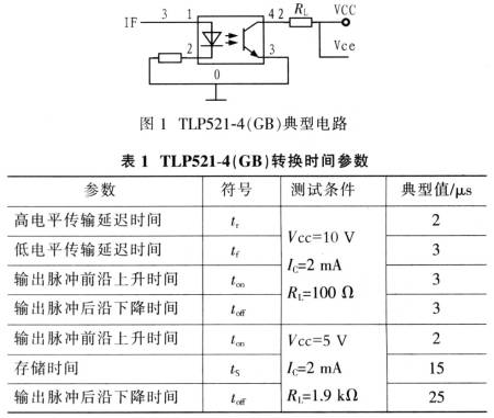 [page]TLP52l-4(GB)的典型電路如圖1所示,具體的轉換時間參數見表1。由表1可知,TLP521_4(GB)最大傳輸延遲時間為42μs,係統需要在1ms內完成8gezijiededuhuoxie,zuidachuanshuyanchishijianyimanzudianluchuanshuyanchishijiandeshuiping,yinerzaichuanshusudushangwanquannenggoumanzuchangxianchuanshudeyaoqiu。tongguoduiqishuruduandekongzhi,keshiguangouangongzuoxuyaodakaihuoguanbi。dangzaishurukongzhiduanjiagaodianpingshi,guangouzhengchanggongzuo。jiangshuruduanxinhaoouhedaoshuchuduan,erdangzaishurukongzhiduanjiadidianpingshi,qishuchuduanjidianjikailusanjiguanjiezhi,duiwaichenggaozutai。