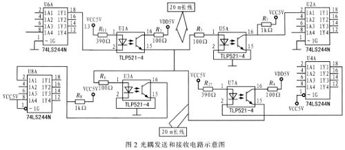 采用光電隔離器TLP521-4對發送和接收設備進行電氣隔離,對於減小交流阻抗的作用十分明顯,進而增大傳輸電流,有效地抑製地線噪聲;同時由於74LS244N的應用。總線驅動能力得到保障。圖2為光耦發送和接收電路示意圖。圖2中,上半部兩光耦自左向右傳輸信號,下半部兩光耦自右向左傳輸信號,左端74LS244N通過靜態存儲器IDT7132與處理器進行數據交換,右端通過8255與處理器進行數據交換。