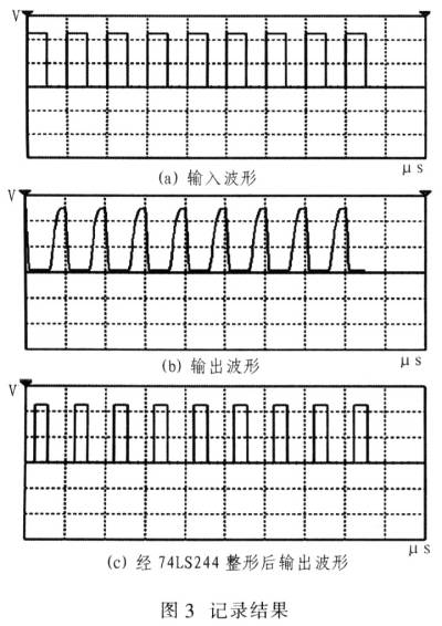 調試中,輸入周期為100μs,占空比為1/2的+5V方波,對一路光耦的輸入端波形和經過20m長線後接收光耦的輸出端波形以及經過74LS244整形後的波形進行記錄。記錄結果如圖3所示。