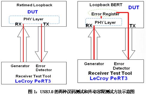 由於USB3.0的速率高達5Gbps,在USB3.0規範中接收機測試成為必測項目。接收機測試包括了誤碼率測試和接收機抖動容限測試兩部分。