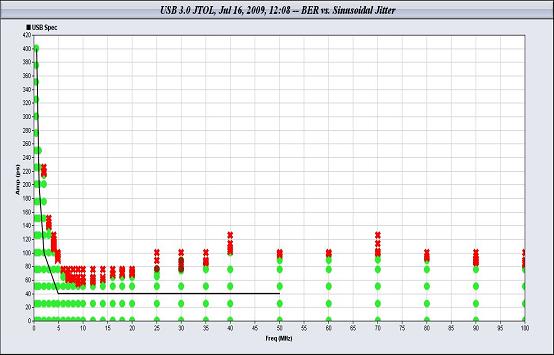 力科PeRT3可以自動測量多個頻點下的抖動容限和誤碼率,如下圖5所示為某USB3.0芯片的抖動容限測試結果,橫軸為頻率,縱軸為該頻點的抖動幅度,黑線為USB3.0規範要求的抖動容限,紅點為出現誤碼的正弦抖動的幅度,由於紅點都在黑線之上,說明該芯片接收端的抖動容限滿足規範要求。