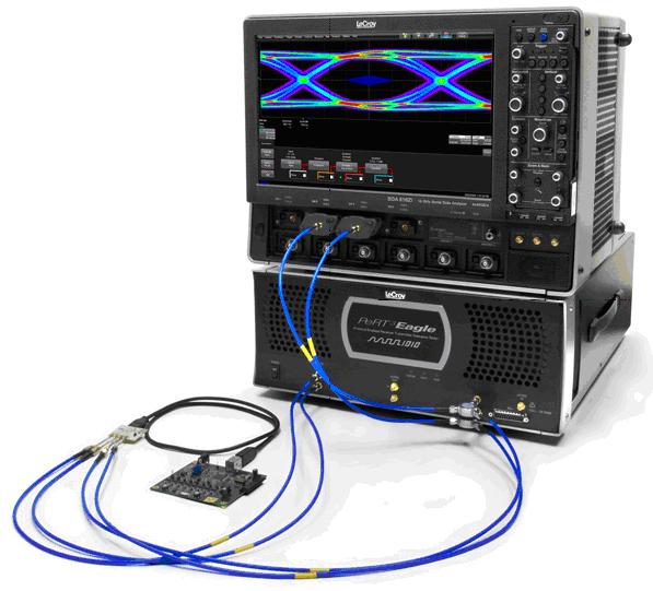 碼型發生器輸出信號的幅度、去加重和抖動參數在圖3中的TP1點用示波器SDA813Zi測量並校準。校準後連接參考測試信道和電纜,通過USB3.0夾具連接到DUT的RX,DUT的TX連接到PeRT3的Error Detector。