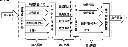 DVI是基於TMDS(TransitionMinimizedDifferentialSignaling,轉換最小差分信號)技術來傳輸數字信號,TMDS運用先進的編碼算法把8bit數據(R、G、B中的每路基色信號)通過最小轉換編碼為10bit數據(包含行場同步信息、時鍾信息、數據DE、糾錯等),經過DC平衡後,采用差分信號傳輸數據,它和LVDS、TTL相比有較好的電磁兼容性能,可以用低成本的專用電纜實現長距離、高質量的數字信號傳輸。TMDS技術的連接傳輸結構如圖1所示。