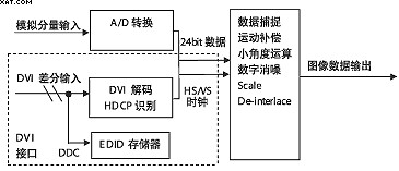 由原理圖看,數字電視增加DVI接口比較簡單,從硬件電路考慮,一是在接口處增加DVI解碼部分,二是在後端提供一個數據通道,如果電視原有方案中具有A/D轉換和相應的後級數據處理通道,那麼DVI接口解碼輸出的數據可以與它共用,因為在數字信號格式一定的情況下,其碼率、行頻、場頻、時鍾是一致的。