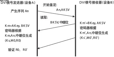 HDCP具體工作過程:首先由主機發送密鑰選擇導引序列(AKSV)和64bit偽隨機序列(An)到接收方,接收方回傳密鑰選擇導引序列(BKSV)和轉發器位(REPEAT-bit)(如是轉發器用以表示身份),發送方確認BKSV是否已被廢除和是否包含20個1和20個0;如果雙方的設備密鑰和KSV有效,則計算產生一個56bit的公共密鑰Km和Km`,然後可產生KS、KS`(傳輸密鑰)、M0、MO`(64bit後續驗證用追加初始序列)、RO、R0`(16bit指示驗證成功,它必須在AKSV發送後100ms內傳回發送方;驗證成功後R01和R0相等;每128幀修正一次,每2s回傳一次)。因此當DVI接口中斷傳輸2s以上,或是非授權設備接收時,主機將停止傳輸內容,以達到保護傳輸內容的目的。HDCP鑒定處理過程如圖6所示。