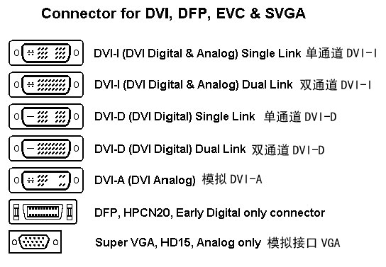 DVI-A是一種模擬傳輸標準,晚期的大屏幕專業CRT中能看見。不過由於和VGA沒有本質區別,性能也不高,因此DVI-A事實上已經被廢棄了。至於DFP接口,這是一種已經被廢棄的早期的數字規範。