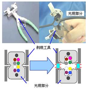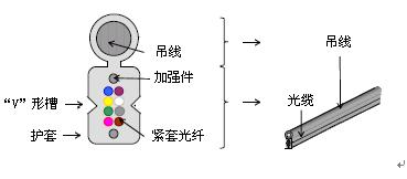這種纜采用PVC緊套光纖,金屬吊線,PVC或LSZH做阻燃護套層,適合於室內布線使用,性能穩定可靠;采用小彎曲半徑光纖生產,具有優良的抗彎性能;阻燃;施工方便可靠。可以選用專門的工具進行剝纜,從光纜“V”形槽區域剝開,獲得緊套光纖,操作簡單。如圖3所示。