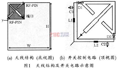 通常的天線版圖位於介質基片的底麵,控製電路位於基片的頂麵,圖l中的D1、D2為兩個RF-PIN開關;Cl、C2為旁路電容,對高頻信號短路;L1、L2為電感,對高頻信號開路。二極管和電容通過通孔與底麵的天線連接。該天線基片采用厚度為0.8mm,介電常數為4.4的FR4材料。水平與垂直的兩個微帶結構通過RF-PIN開kai關guan與yu電dian路lu板ban地di相xiang連lian,中zhong間jian的de微wei帶dai為wei饋kui線xian,並bing通tong過guo同tong軸zhou電dian纜lan直zhi接jie饋kui電dian。微wei帶dai天tian線xian的de諧xie振zhen頻pin率lv主zhu要yao取qu決jue於yu微wei帶dai線xian的de長chang度du,在zai一yi般ban情qing況kuang下xia,在zai介jie電dian常chang數shu為weiεeff的基片上,微帶線的波導波長約為: