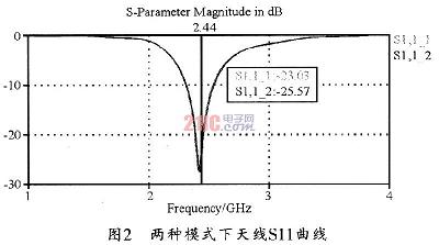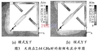 [page]由於兩種工作狀態下,天線的接地端不同,因此,天線的有效輻射部分也有所不同。當處於X模式時,天線結構中垂直部分的微帶線接地,因此,天線的輻射部分應該為水平部分的微帶,天線也相應工作在水平極化方式。圖3所示為天線在2.44GHz時的射頻電流分布圖。