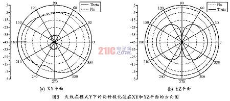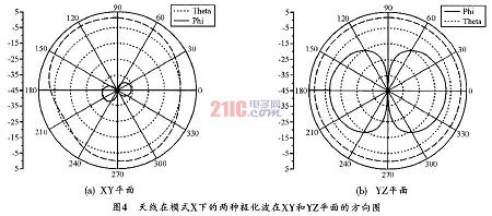 從圖3可以看出,射頻電流主要集中在天線水平方向的微帶線上(這印證了前麵的分析)。但同時,在中間部分的微帶以及天線其他部分也存在射頻電流,因此,天線仍會輻射部分垂直極化波。圖4所示為天線的兩種極化波在XY及YZ平麵的方向圖。