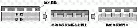 納米印刷技術的基本原理如圖1所(suo)示(shi),就(jiu)是(shi)把(ba)有(you)納(na)米(mi)級(ji)凹(ao)凸(tu)圖(tu)形(xing)的(de)模(mo)板(ban)擠(ji)壓(ya)在(zai)塗(tu)覆(fu)了(le)樹(shu)脂(zhi)薄(bo)膜(mo)的(de)基(ji)板(ban)上(shang),再(zai)在(zai)樹(shu)脂(zhi)薄(bo)膜(mo)的(de)表(biao)麵(mian)複(fu)製(zhi)凹(ao)凸(tu)圖(tu)形(xing)。在(zai)普(pu)通(tong)的(de)納(na)米(mi)印(yin)刷(shua)技(ji)術(shu)中(zhong),能(neng)等(deng)倍(bei)複(fu)製(zhi)模(mo)板(ban),而(er)在(zai)高(gao)寬(kuan)比(bi)納(na)米(mi)印(yin)刷(shua)技(ji)術(shu)中(zhong),則(ze)能(neng)形(xing)成(cheng)高(gao)出(chu)納(na)米(mi)模(mo)板(ban)凹(ao)部(bu)的(de)結(jie)構(gou)體(ti)。