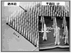 在高寬比納米印刷技術中,可以簡單地形成直徑為25nm、高3μm(平麵比為12)的納米級柱狀結構集合體(見圖2)。該結構在以往的精密塑料成型中是很難形成的,但使用了高寬比納米印刷技術,用一次壓延就能成型。