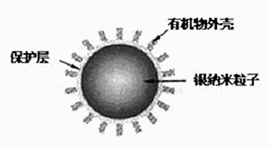 由於納米粒子表麵呈活性,為防止其自身凝聚必須要做表麵控製。我們所用的納米粒子是平均直徑為10nm左右的銀納米粒子,其表麵用有機物保護層進行了塗覆。圖3為有機物—銀複合納米粒子的掃描電鏡圖像,圖4為其結構模式圖。