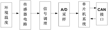 該溫度檢測節點由傳感器電路、信號調理電路、單片機應用係統、CAN總線接口等構成。電路基本工作原理是:傳感器電路將感應到的溫度信號以電壓的形式輸出到信號調理電路,信號經過調理後輸入到A/D采樣電路,由ADC將jiang數shu字zi量liang值zhi送song給gei單dan片pian機ji係xi統tong。單dan片pian機ji係xi統tong將jiang監jian控kong實shi時shi溫wen度du,當dang溫wen度du超chao過guo警jing戒jie值zhi和he危wei險xian值zhi時shi,單dan片pian機ji將jiang主zhu動dong發fa送song警jing告gao信xin息xi到dao上shang位wei機ji,提ti醒xing操cao作zuo人ren員yuan檢jian查zha。模mo塊kuai邏luo輯ji結jie構gou如ru圖tu1所示。