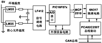 本節點的核心MCU是PIC16F87x,是Microchip公司推出的低功耗8位單片機。PIC16F87x擁有精簡指令集,執行速度為200ns。CAN控製器采用Microchip公司的MCP2510,總線驅動器采用PCA82C250,總線隔離電路采用光耦6N317,信號調理電路采用LF412。溫度監測模塊的硬件結構如圖2所示。