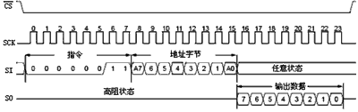 在讀操作開始時,CS引腳將被置為低電平。隨後讀指令和8位地址碼(A7~A0)將被依次送入MCP2510。在接收到讀指令和地址碼之後,MCP2510指定地址寄存器中的數據將被移出通過SO引yin腳jiao進jin行xing發fa送song。每mei一yi數shu據ju字zi節jie移yi出chu後hou,器qi件jian內nei部bu的de地di址zhi指zhi針zhen將jiang自zi動dong加jia一yi以yi指zhi向xiang下xia一yi地di址zhi。因yin此ci可ke以yi對dui下xia一yi個ge連lian續xu地di址zhi寄ji存cun器qi進jin行xing讀du操cao作zuo。通tong過guo該gai方fang法fa可ke以yi順shun序xu讀du取qu任ren意yi一yi個ge連lian續xu地di址zhi寄ji存cun器qi中zhong的de數shu據ju。通tong過guo拉la高gaoCS引腳電平可以結束讀操作,如圖6所示。