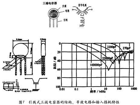 由於普通的兩端電容有引線電感,所以總的剩餘電感較大,自諧振點也比較低。為了改進普通引線式電容器的自諧振、且自諧振頻率偏低的問題,村田製作所曾發展了一種引線式三端電容器,見圖7。與兩端電容相比,這個電容的上引線化成了兩根(所以三端電容有三根引線)。三端電容器的這兩根上引線化成了信號傳輸線的一部分,於是引線電感與電容器變成了一個“LC”濾(lv)波(bo)器(qi)。正(zheng)是(shi)三(san)端(duan)電(dian)容(rong)器(qi)巧(qiao)妙(miao)地(di)利(li)用(yong)了(le)引(yin)線(xian)電(dian)感(gan),使(shi)得(de)三(san)端(duan)電(dian)容(rong)器(qi)對(dui)幹(gan)擾(rao)的(de)抑(yi)製(zhi)作(zuo)用(yong)更(geng)好(hao)。三(san)端(duan)電(dian)容(rong)器(qi)也(ye)有(you)自(zi)諧(xie)振(zhen)問(wen)題(ti),為(wei)了(le)最(zui)大(da)限(xian)度(du)地(di)限(xian)製(zhi)這(zhe)個(ge)問(wen)題(ti),使(shi)用(yong)時(shi)三(san)端(duan)電(dian)容(rong)器(qi)接(jie)地(di)的(de)這(zhe)根(gen)引(yin)腳(jiao)的(de)長(chang)度(du)應(ying)該(gai)受(shou)到(dao)限(xian)製(zhi)。