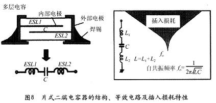 應ying該gai說shuo片pian式shi二er端duan電dian容rong器qi的de出chu現xian對dui於yu改gai進jin普pu通tong引yin線xian式shi電dian容rong器qi的de自zi諧xie振zhen問wen題ti是shi很hen有you好hao處chu的de,因yin為wei片pian式shi二er端duan電dian容rong器qi的de引yin線xian長chang度du得de到dao了le最zui大da限xian度du縮suo減jian。但dan由you於yu電dian容rong器qi內nei部bu的de構gou造zao,並bing不bu能neng夠gou消xiao除chu內nei部bu電dian極ji的de殘can留liu電dian感gan,這zhe樣yang當dang頻pin率lv達da到dao使shi電dian容rong器qi的de容rong抗kangXC同殘留電感的XL的絕對值相等時,二端電容依然會產生自諧振,參見圖8。youyuzixiezhenpinlvdecunzai,dangzaoshengdepindaichaoguozixiezhenpinlvzhihou,zaoshengdeyizhixiaoguohuijisuxiajiang。danshiyuputongyouyinxiandeerduandianrongxiangbijiao,haishiyouhendagaijin。