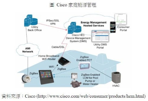 Cisco HEC主要以ZigBee無線網路協定直接與相容的家電進行連結;其他未連線家電則可透過與內建ZigBee係統的可編程通訊型溫控器(Programmable Communicating Thermostat,PCT)或負載控製模組(Load Control Module,LCM)來與HEC進行連結。對外方麵,HEC則透過WiFi無線網路協定與寬頻連結,進一步與Cisco能源管理服務平台連線。服務平台則依據使用狀態、尖離峰動態電價等多項因素來提供最適的電力使用配置建議。未來隨著智慧家電的推出,HEC更可接受家電使用狀態資訊,通知使用者進行保養與維修動作。