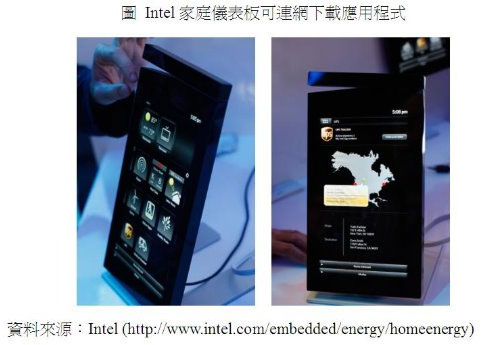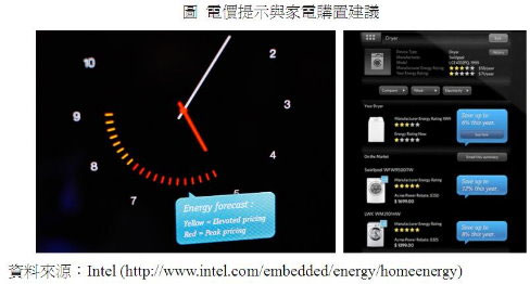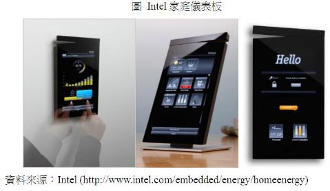 如同前述的家庭能源管理項目,Intel儀表板透過ZigBee無線技術連結家中的各項家電,監控用電狀況。此外,透過WiFi連結家中寬頻網路,可與當地的電力公司進行資訊傳遞或更新(或透過Zigbee技術與智慧電表連結,進一步與電力公司連線)。而透過儀表板上顯示的差異電價時段或市麵上各項家電的耗能(節費)資訊,儀表板可以提供使用者用電與家電購置的建議,甚至可協助計算需使用多久的時間才能回本。