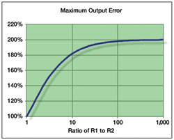 如果R1和R2的阻值不同,那麼電壓輸出的誤差將逼近固有的電阻容差的兩倍,如圖3所示。分壓器設計的最壞情況出現在兩個電阻的容差正好相反時。如果分壓器的設計采用了容差為±0.1%的電阻,那麼在此比率下輸出誤差最壞可達±0.2%。