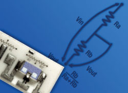 傳輸函數表示,輸出電壓取決於輸入電壓以及R1和R2的阻值。在這種理想狀態下,輸出電壓精確地按照R2/(R1+R2)計ji算suan,同tong時shi這zhe個ge比bi值zhi取qu決jue於yu輸shu入ru電dian壓ya,以yi及ji電dian阻zu元yuan件jian能neng夠gou工gong作zuo的de全quan部bu溫wen度du。但dan電dian阻zu並bing不bu是shi理li想xiang狀zhuang態tai中zhong的de。實shi際ji的de電dian阻zu具ju有you固gu有you容rong差cha和he溫wen度du係xi數shu,可ke能neng會hui給gei電dian子zi係xi統tong引yin入ru很hen大da的de誤wu差cha。