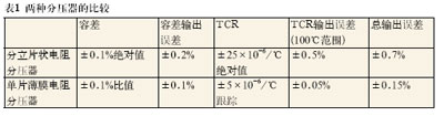 表1彙總了這兩種方法。使用0.1%的分立電阻設計分壓器時,由容差和TCR引入的最大輸出誤差是0.7%。使用高精度薄膜電阻時的最大輸出誤差是±0.15%——性能方麵超過4倍的改善。