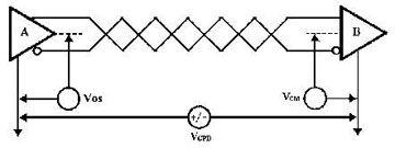 • 共模幹擾問題。的確,RS-485接jie口kou采cai用yong差cha分fen方fang式shi傳chuan輸shu信xin號hao,並bing不bu需xu要yao相xiang對dui於yu某mou個ge參can照zhao點dian來lai檢jian測ce信xin號hao,係xi統tong隻zhi需xu檢jian測ce兩liang線xian之zhi間jian的de電dian位wei差cha就jiu可ke以yi了le。但dan應ying該gai注zhu意yi的de是shi,收shou發fa器qi隻zhi有you在zai共gong模mo電dian壓ya不bu超chao出chu一yi定ding範fan圍wei(-7V至+12V)的條件下才能正常工作。當共模電壓超出此範圍就會影響通信的可靠,直至損壞接口。如圖3所示,當發送器A向接收器B發送數據時,發送器A的輸出共模電壓為VOS,由於兩個係統具有各自獨立的接地係統,存在著地電位差VGPD。那麼,接收器輸入端的共模電壓就會達到VCM=VOS+VGPD。RS-485標準規定VOS≤3V,但VGPD可能會有很大幅度(十幾伏甚至數十伏),並可能伴有強幹擾信號,致使接收器共模輸入VCM超出正常範圍,並在信號線上產生幹擾電流,輕則影響正常通信,重則損壞接口。