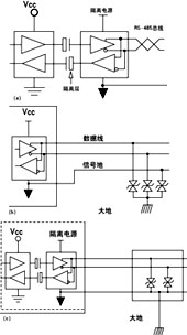 圖5a所suo示shi為wei隔ge離li保bao護hu方fang案an。這zhe種zhong方fang案an實shi際ji上shang將jiang瞬shun態tai高gao壓ya轉zhuan移yi到dao隔ge離li接jie口kou中zhong的de電dian隔ge離li層ceng上shang,由you於yu隔ge離li層ceng的de高gao絕jue緣yuan電dian阻zu,不bu會hui產chan生sheng損sun害hai性xing的de浪lang湧yong電dian流liu,起qi到dao保bao護hu接jie口kou的de作zuo用yong。通tong常chang采cai用yong高gao頻pin變bian壓ya器qi、光耦等元件實現接口的電氣隔離,已有器件廠商將所有這些元件集成在一片IC中,使用起來非常簡便,如Maxim公司的MAX1480/MAX1490,隔離電壓可以到2500V。這種方案的優點是可以承受高電壓、持續時間較長的瞬態幹擾,實現起來也比較容易,缺點是成本較高。